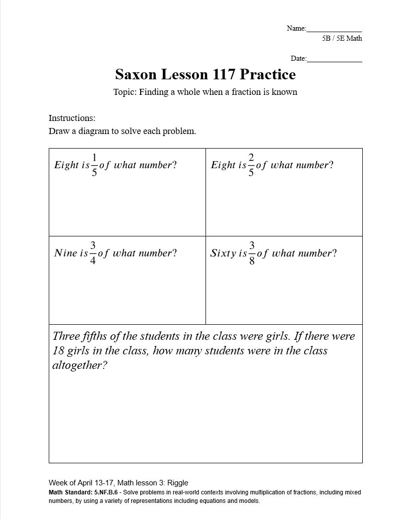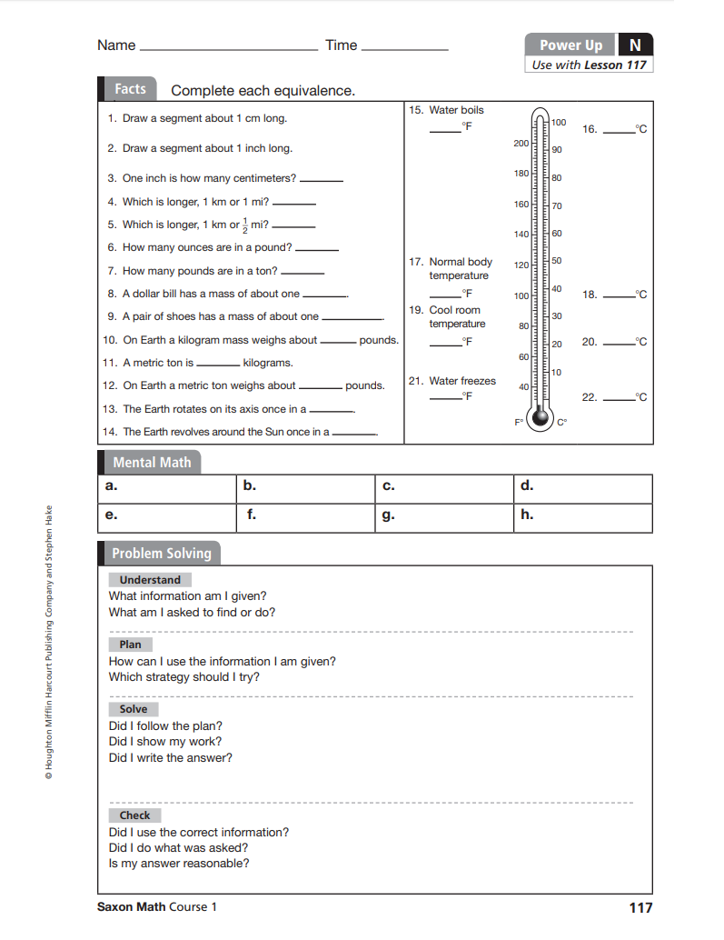 Math: Saxon Lesson 117 Reteach, approximately 1 hour - 1 ½ hour